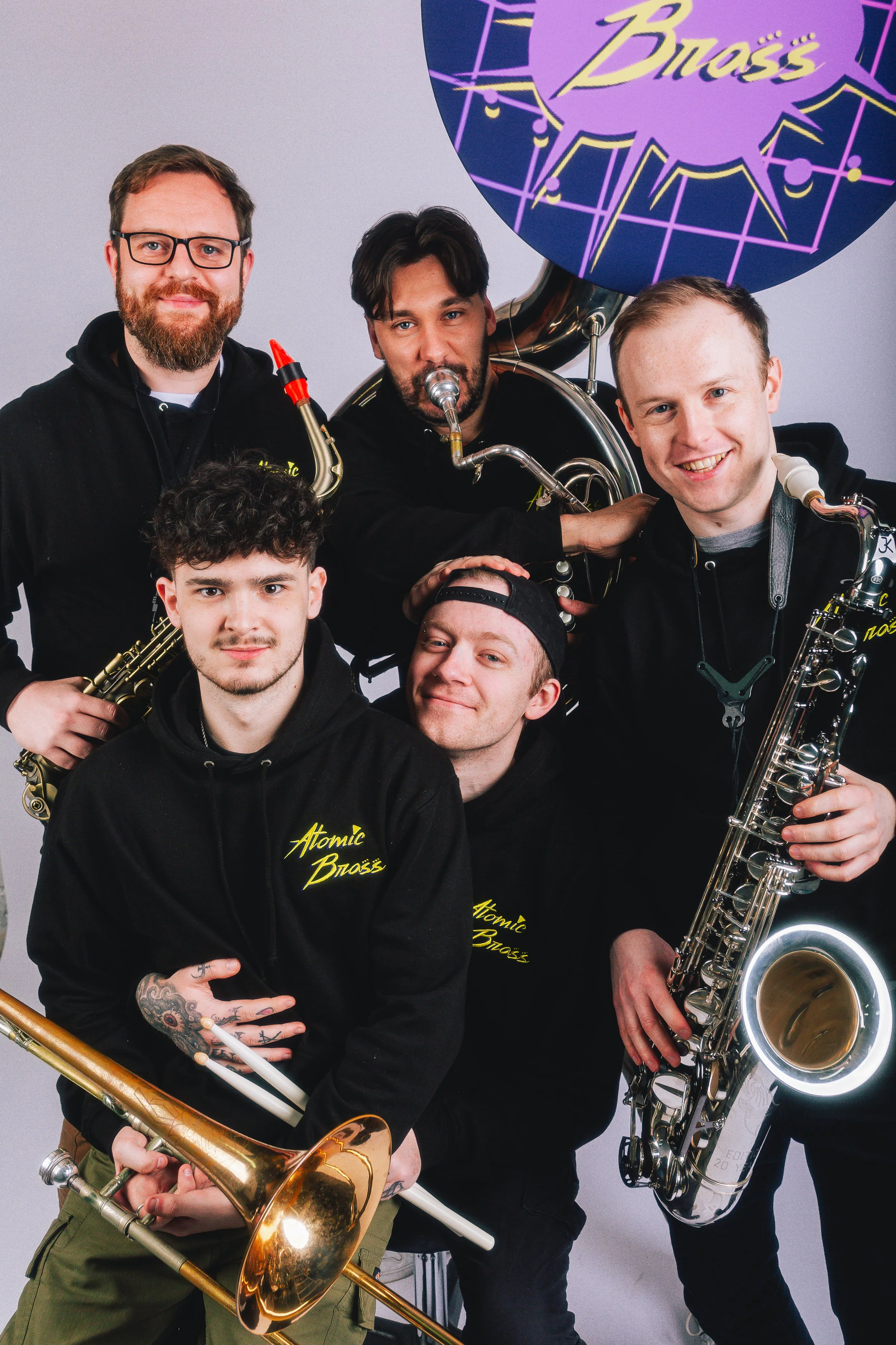 A COLLECTIVE OF FIVE NORTH WEST MUSICIANS, ATOMIC BRASS WAS CREATED FROM A LOVE OF REIMAGINING POPULAR TUNES FROM A RANGE OF GENRES AND BLENDING THEM TOGETHER WITH JAZZ AND FUNK GROOVES. RESULTING IN UNDENIABLY CATCHY DANCE RHYTHMS OUR AUDIENCES HAVE PROVEN TO LOVE AGAIN AND AGAIN.